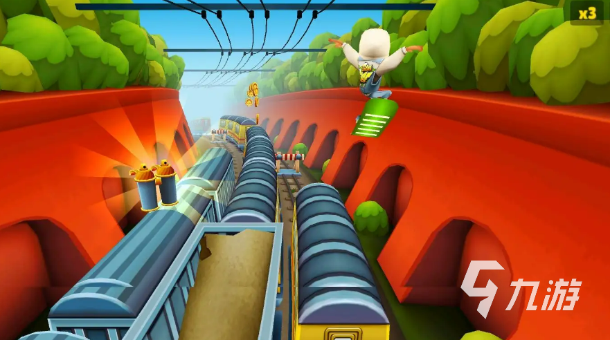 《地鐵跑酷》是一個扮演一個熊孩子奔跑的游戲,是在火車附近奔跑,要注意迎面而來的火車哦,如果不及時的躲避就會被撞飛的,游戲當然還有很多用得上的道具能拾取,比如可以吸收玩家身邊所有金幣的吸鐵石還有一些需要收集的英文字母。