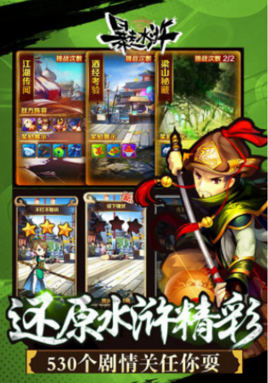 以水滸劇情為藍(lán)本,顛覆了經(jīng)典形象,李逵魯智深本身都是無(wú)比匆忙的勇者,但在此游戲中卻將這些角色打造成為萌娘設(shè)計(jì),足夠獨(dú)特的形象,具有極強(qiáng)的視覺(jué)沖擊力。劇情涵蓋很多無(wú)比經(jīng)典的橋段,倒拔垂楊柳經(jīng)典故事在這里呈現(xiàn)以以幽默又非常搞笑的風(fēng)格重新演繹,顛覆了人們對(duì)傳統(tǒng)水滸的認(rèn)知。