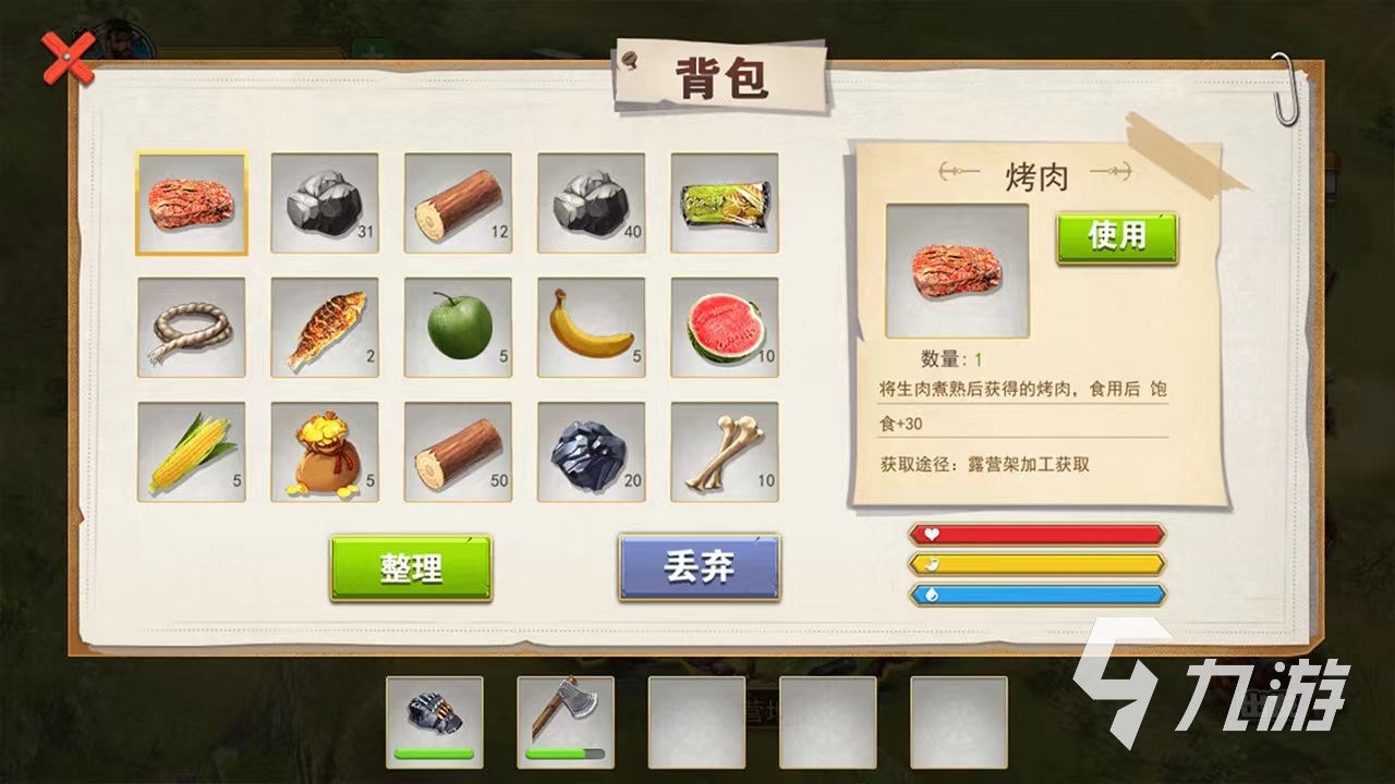 《荒島生存》顧名思義是一款生存游戲,玩家要學(xué)著怎么在荒島活下來,各種生存的必需品都要從周遭的環(huán)境中獲取,玩家需要砍伐樹木來獲取木材,建造工具桌和遮風(fēng)擋雨的房子,制作武器捕獵等。