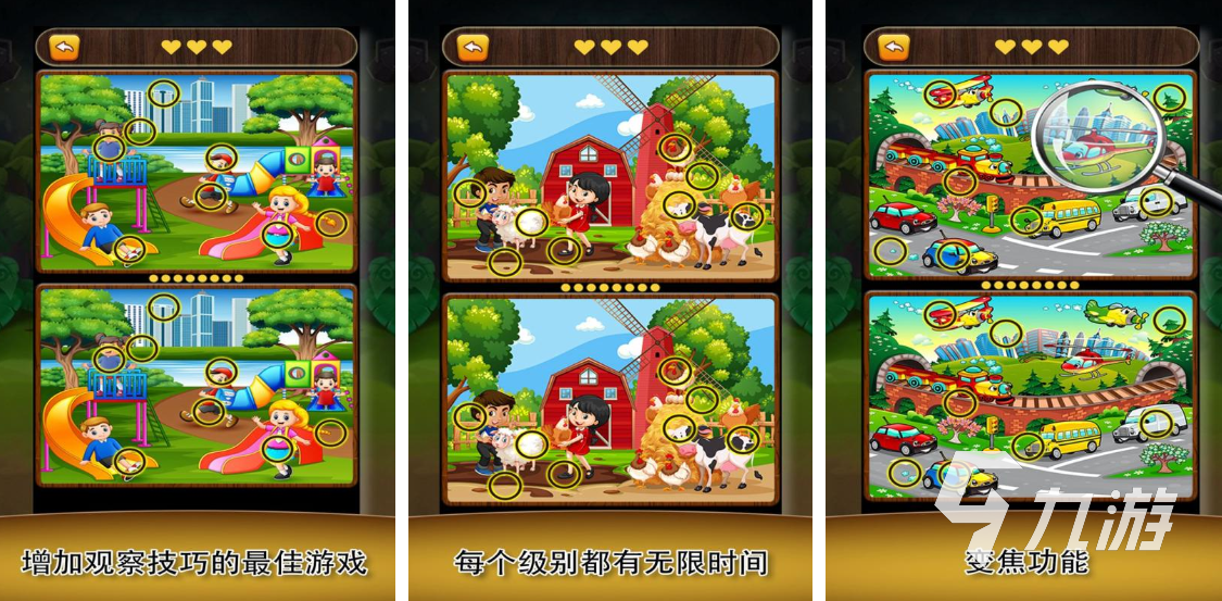 《寶寶來找茬》同樣是為了大家專注力而設(shè)計的一款游戲,游戲畫風(fēng)較為可愛,玩法也特別簡單,只要找出兩張圖片的不同之處就行,通關(guān)規(guī)則也很簡單,全部找出不同之處圈起來即可。游戲內(nèi)共有四大主題,100多個趣味的關(guān)卡,且關(guān)卡難度從簡單到復(fù)雜全都有。保障大家玩得開心的同時又可以訓(xùn)練專注力。