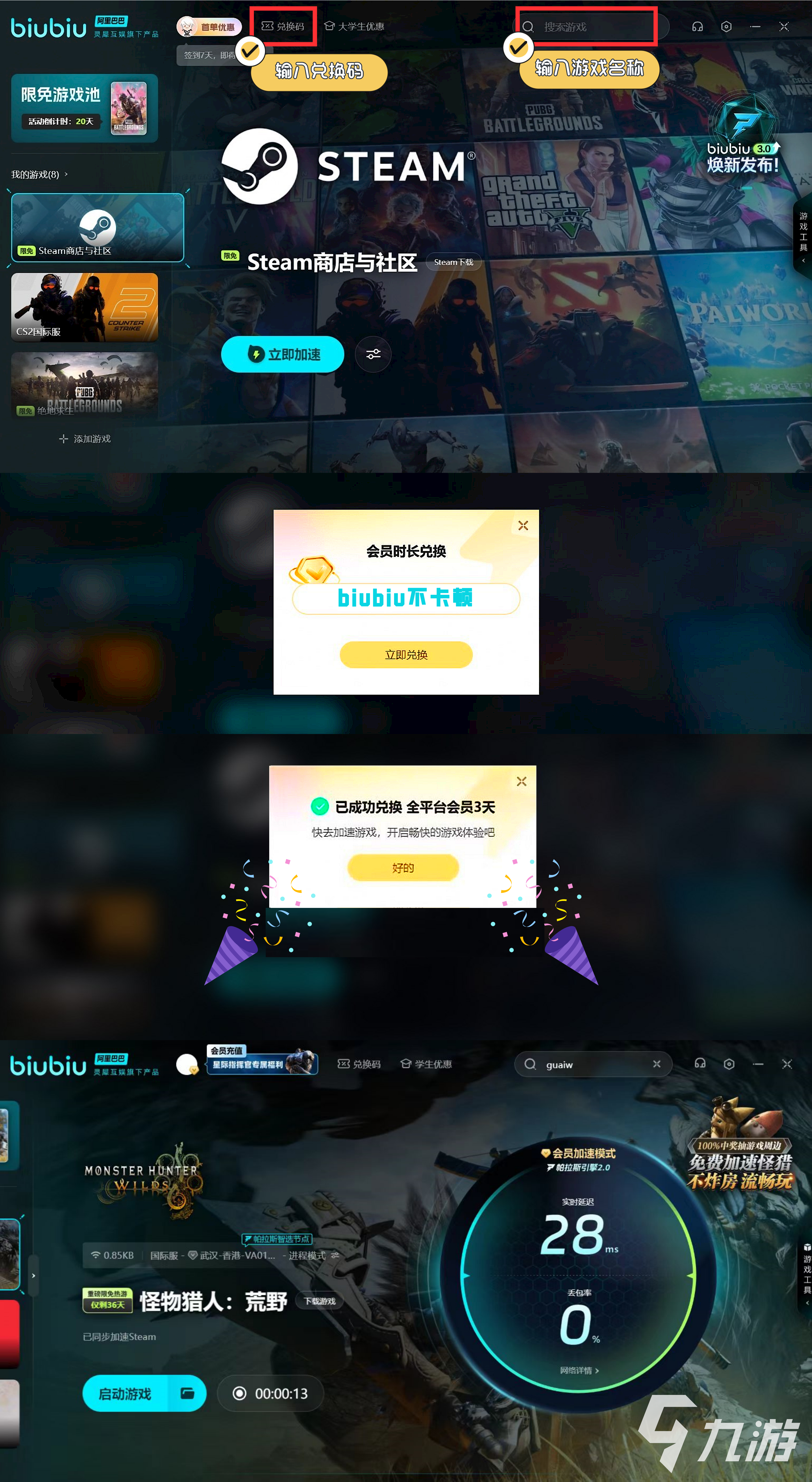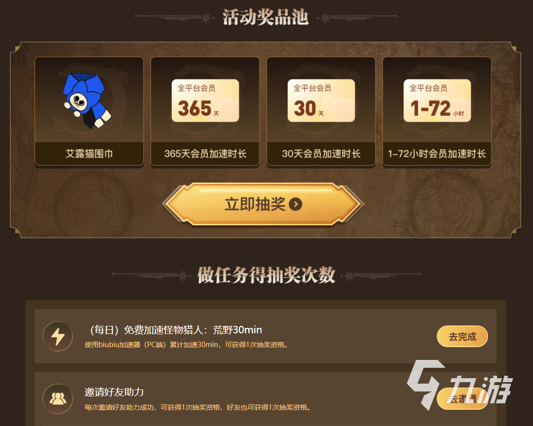 小編還想告訴大家一個(gè)好活動(dòng),參與超級賺的。2.7-2.17期間,我們用biubiu提速怪獵是免費(fèi)的,讓我們流暢玩,不炸房。然后去參與抽獎(jiǎng)吧,有游戲本體還有biubiu會(huì)員拿,會(huì)員有365天,30天,還有1-72小時(shí)的。抽獎(jiǎng)次數(shù)大家進(jìn)行加速就能擁有,另外邀請好友還能多一次呢,每天0點(diǎn)就重置了,要抓緊機(jī)會(huì)去獲取哦。