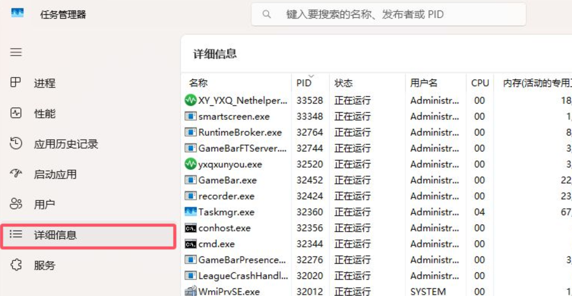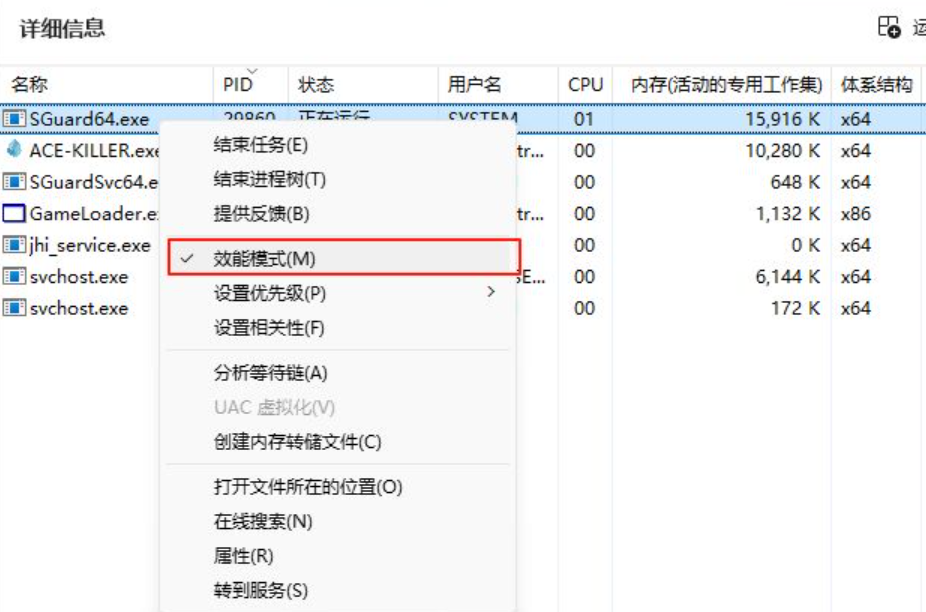 然后任務(wù)管理器里點(diǎn)選“詳細(xì)信息”,從上面的搜索欄找到"ACE”,然后可以找到一個(gè)名為“SGuard64.exe”、“SGuardSvc64.exe”這兩個(gè)程序,右鍵這些程序,在出現(xiàn)的右鍵菜單中勾選上“效能模式”。然后再在“設(shè)置優(yōu)先級(jí)”的下級(jí)菜單中勾選“低”。