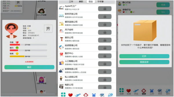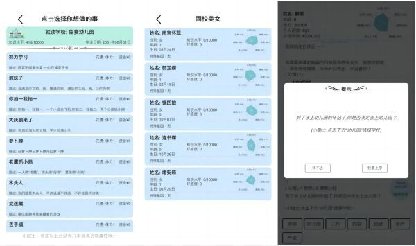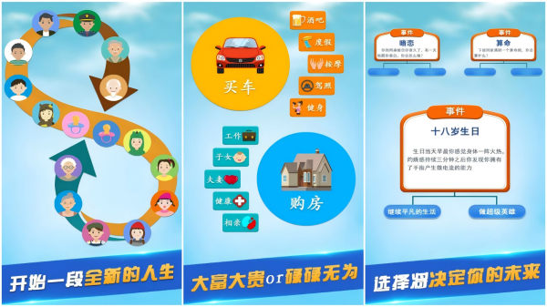 此游戲最為獨(dú)特之處,在于玩家們的人生之路抉擇分支,十分的細(xì)致入微。不同的年齡階段,會(huì)呈現(xiàn)出對應(yīng)的事件隨機(jī)選項(xiàng),例如學(xué)業(yè)之路上,選擇讀文讀理,還是走藝術(shù)發(fā)展路。職業(yè)選擇上的,或是經(jīng)商、或是從醫(yī)等?!锻昝廊松吠暾实纳芷谀M,同時(shí)在場景的塑造上,也十分精彩多元化,家庭、職場、學(xué)校各種類型場景應(yīng)有盡有,帶給大家的體驗(yàn)感極致豐富精彩。