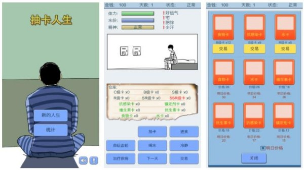 最后介紹一款將人生模擬與趣味抽卡,進(jìn)行巧妙結(jié)合的小游戲《抽卡人生》,資源匱乏的游戲背景之下,各位玩家面對的一應(yīng)物資,都是隨機(jī)抽卡的行為中獲取的,因此這款游戲,充滿對大家運(yùn)氣的考驗(yàn)噢。同時(shí)模擬的人生發(fā)展也是周期很長的,因此需要大家對一切資源,以及發(fā)展之路,進(jìn)行策略部署安排。真實(shí)的人物體能指數(shù)狀況模擬,也令各位可以獲取帶入感絕佳的沉浸體驗(yàn)。