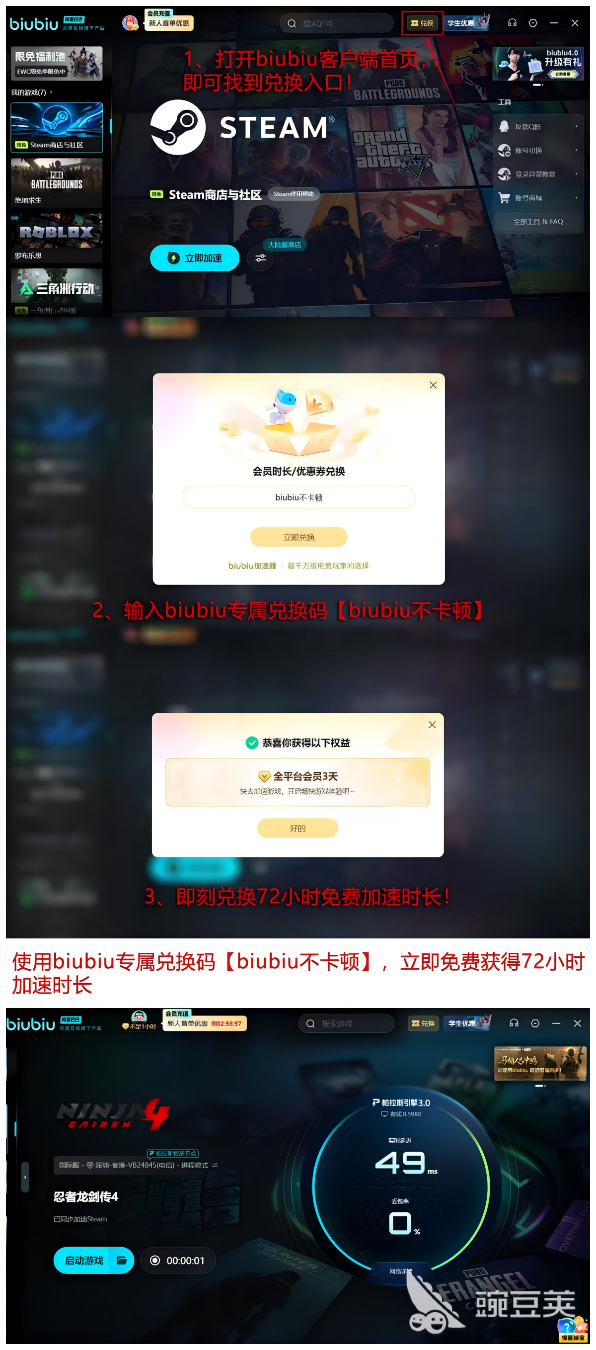 目前市面上眾多加速工具中,biubiu加速器以其穩(wěn)定性和高性價(jià)比脫穎而出。平臺(tái)經(jīng)常推出限時(shí)福利活動(dòng),尚未嘗試的用戶注意:輸入口令【biubiu不卡頓】至右上角【兌換】欄,即可領(lǐng)取3天免費(fèi)使用權(quán);若為新注冊(cè)賬號(hào),還可額外獲得24小時(shí)暢玩資格,總計(jì)可達(dá)96小時(shí)免費(fèi)體驗(yàn)時(shí)長(zhǎng),對(duì)于希望深度體驗(yàn)游戲內(nèi)容的玩家來(lái)說(shuō)極具吸引力。