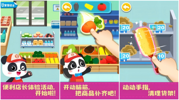 最后是一款模擬經(jīng)營背景的趣味小游戲。小朋友講以便利店管理者的身份登場,涉及豐富的動(dòng)手能力、思維邏輯反應(yīng)挑戰(zhàn),能夠令孩子享受奇妙的娛樂體驗(yàn)?!秾殞毐憷觊L寶寶巴士》中,不僅需要孩子們進(jìn)行各種商品的入庫、擺放、整理,同時(shí)也會(huì)有需要幫助的客人需要孩子尋找物品,結(jié)賬等。雖然娛樂內(nèi)容豐富,但是也會(huì)配備相應(yīng)的指示,不必?fù)?dān)心孩子會(huì)手忙腳亂。