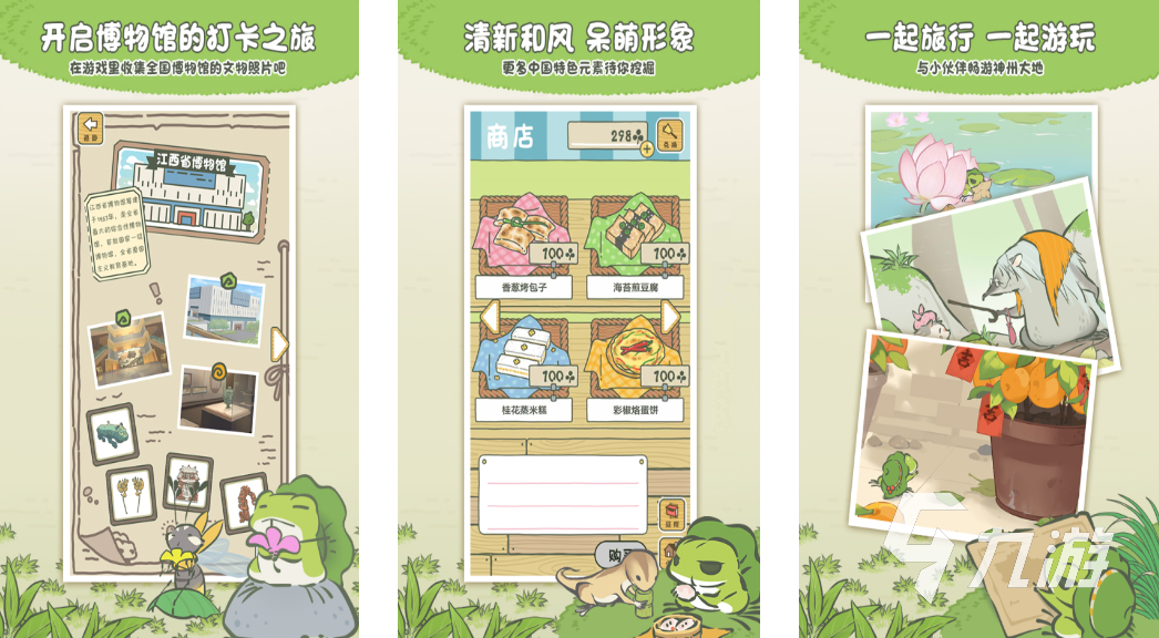這款游戲中的小青蛙將踏足中國(guó)廣袤的河山,游歷名勝古跡,品嘗各地美食。為了青蛙的冒險(xiǎn)之旅,玩家需要悉心準(zhǔn)備,收集四葉草來(lái)購(gòu)買(mǎi)各種物品,也可以通過(guò)旅行中的發(fā)現(xiàn)和種植的三葉草換取所需,確保青蛙的旅途順利,通過(guò)青蛙帶回的精彩照片,感受中國(guó)美景與歷史的魅力。此外可以陪伴青蛙在家中度過(guò)悠閑時(shí)光,比如吃飯、睡覺(jué)以及學(xué)習(xí)。