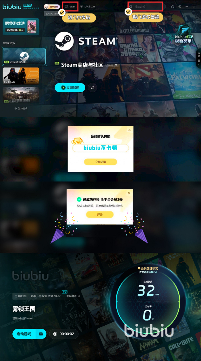 在收集資源和制作過程中,部分玩家可能會遇到延遲、卡頓甚至掉線等問題,尤其是在野外大規(guī)模活動時或與其他玩家交互期間,這類問題會嚴重影響游戲體驗。此時,選擇一款穩(wěn)定的游戲加速器顯得尤為重要。biubiu加速器在應對《霧鎖王國》這類大型多人在線游戲時表現(xiàn)十分出色,不僅能夠優(yōu)化網(wǎng)絡連接、減少掉線,還支持節(jié)點切換,確保玩家在不穩(wěn)定網(wǎng)絡環(huán)境下依然可以流暢運行游戲。值得一提的是,biubiu加速器為新用戶提供了十分厚道的免費加速時長——首次注冊即可領(lǐng)取24小時免費體驗時長,此外,在加速器頁面中輸入通用口令【biubiu不卡頓】還能額外解鎖72小時的加速時長,二者合并,能連續(xù)享受長達75小時的免費服務,幾乎能覆蓋一周時間的正常游戲需求,對于想要穩(wěn)定暢玩《霧鎖王國》的玩家來說,這無疑是極具吸引力的福利。
