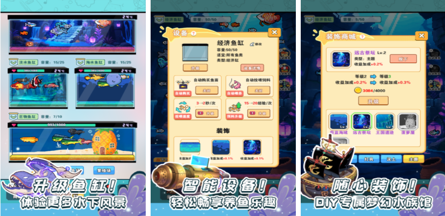 養(yǎng)魚大師非常適合老年人,游戲里不會有復雜的設定,每個成員都能來里面建造一個虛擬的魚缸,并且不斷去收集各種魚類,每個魚類都會有不同的養(yǎng)殖需求,按照實際的需求把它們放置在魚缸里,后期這些魚缸還可以不斷的進行裝飾,每個人都能在這個游戲里擁有一個屬于自己的小世界,后期各種智能設備的加入,也能讓養(yǎng)魚變得更加輕松一些。