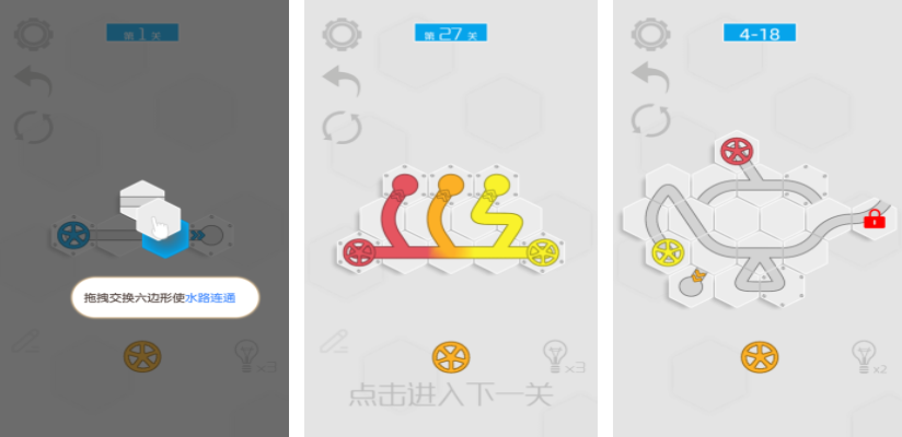 在六邊形接水管這個游戲里,會設定水管的開關和出口,中間的水管都雜亂無章,玩家需要做的就是,不斷調整這些方塊的方向,讓這些水管能從開關連接到水龍頭處,等水管通暢之后,就可以打開開關,等水順利通過水管之后,挑戰(zhàn)正式完成,大家就可以繼續(xù)進入到下一關,每一關水管的排布方式都不一樣,需要不斷動腦才能完成挑戰(zhàn)。