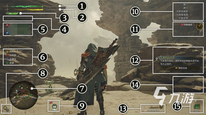 6是導(dǎo)蟲通知,告訴大家周圍可以采集什么,7是小地圖,8是環(huán)境示警,告訴我們天氣跟時間段的,9則是告訴我們當(dāng)前目標(biāo)怪物是什么。10是操作指南,告訴我們當(dāng)前武器能用什么操作。11則是任務(wù)目標(biāo),我們當(dāng)前需要做的事情。