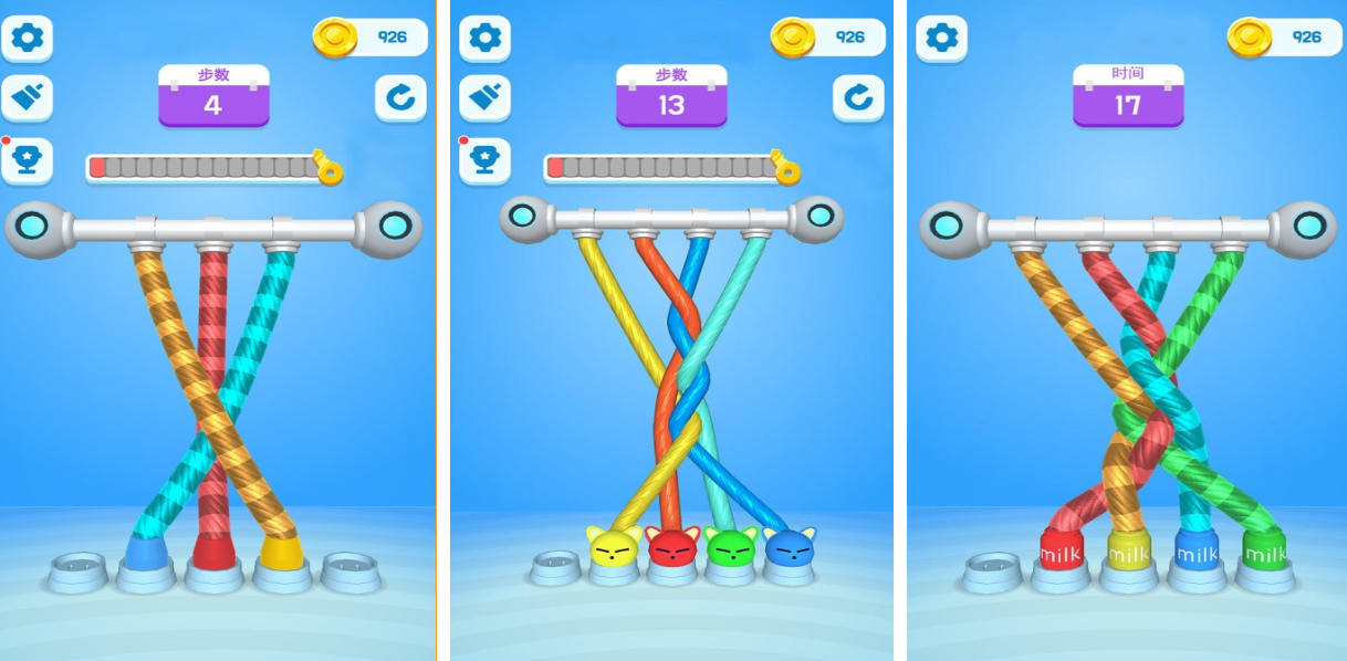 本作是難度并不高的一款繩索主題解謎互動類游戲,通過將所有繩索解開進(jìn)行闖關(guān)的機(jī)制代入感很強(qiáng),一團(tuán)亂麻一般的繩索設(shè)定讓游戲更具辨識度,玩家要尋找線索將繩索全部解開才能通關(guān),很快的游戲節(jié)奏令解繩子愛好者流連忘返,倒計時的基礎(chǔ)設(shè)定讓這款解謎游戲的緊迫感大大提升。