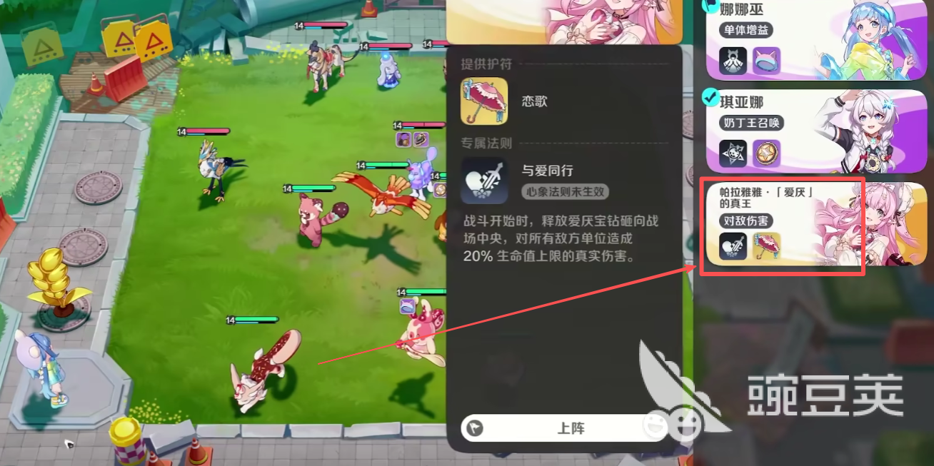 在武器的選用上面,則建議玩家為佩纓章魚攜帶,帕帕雅雅這一角色,由于她擁有戀歌護(hù)符,并且專屬法則與愛同行,在戰(zhàn)斗開始期間,可以使用一個新型的寶鉆,直接砸向?qū)Ψ降膱龅刂醒?,對敵方所有單位造成一次,基于生命上?0%的真實傷害。