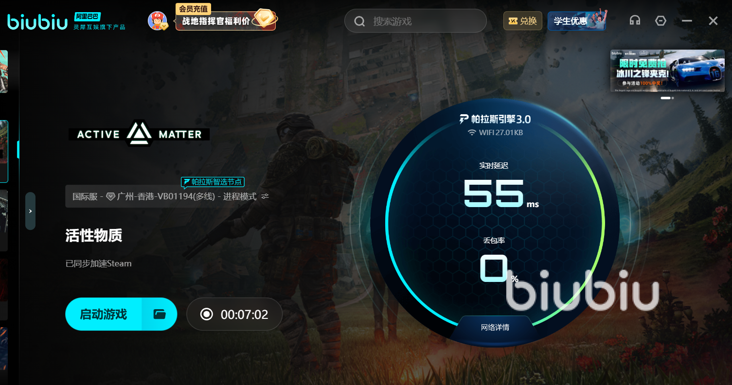 為了助力玩家暢享ActiveMatter,biubiu特別準(zhǔn)備了豐厚的福利禮遇,新用戶注冊(cè)即送24小時(shí)免費(fèi)VIP加速體驗(yàn),此外,輸入【biubiu不掉線】即可額外獲得72小時(shí)加速時(shí)長(zhǎng),累積疊加使用共計(jì)96小時(shí)無(wú)卡頓流暢戰(zhàn)斗體驗(yàn),帶你領(lǐng)略未來(lái)戰(zhàn)場(chǎng)的真正節(jié)奏。