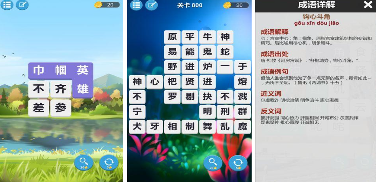 中華成語(yǔ)大會(huì)這款識(shí)成語(yǔ)主題的解謎類游戲包含的關(guān)卡超級(jí)多,你將以成語(yǔ)大師的身份來(lái)到成語(yǔ)世界進(jìn)行解謎,每一關(guān)需要填寫的成語(yǔ)都是與眾不同的,成語(yǔ)知識(shí)注解詳細(xì)能快速了解成語(yǔ)的歷史,模式不同帶來(lái)的操作理念也都有所區(qū)別,極強(qiáng)的新鮮感讓大家對(duì)成語(yǔ)類的知識(shí)充滿好奇,背景塑造小清新能幫助大家專注于成語(yǔ)知識(shí)的破解。