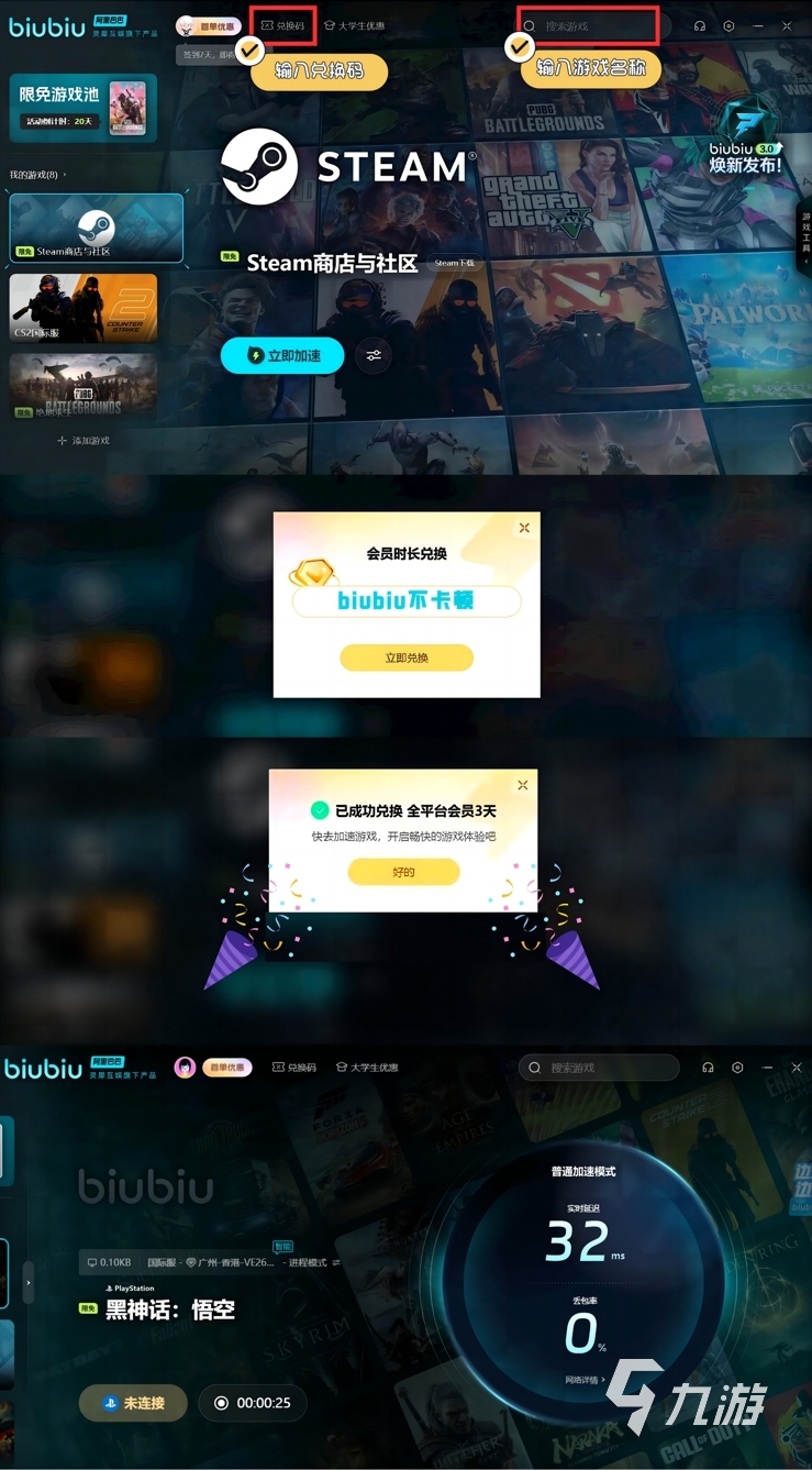 更有一個(gè)好消息帶給大家,新人使用biuibiu本身就擁有免費(fèi)的24小時(shí)加速時(shí)間了,另外在首頁(yè)參與兌換,不管是新老用戶,都能使用兌換碼【biubiu不卡頓】哦,兌換到72小時(shí)額外的免費(fèi)加速時(shí)間,等于加起來給新用戶用到的免費(fèi)時(shí)間足足有96小時(shí)了。