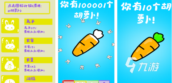 胡蘿卜是小兔子菜單當(dāng)中首屈一指的美食,因此在屏幕中就會(huì)看到很多的小兔子和一根長(zhǎng)長(zhǎng)的胡蘿卜。最終的操作要求就是不斷點(diǎn)擊胡蘿卜,讓其中的小兔子實(shí)現(xiàn)胡蘿卜自由。通過(guò)逐漸點(diǎn)擊屏幕之后即可升級(jí)大量的胡蘿卜,比如在屏幕上都會(huì)呈現(xiàn)出胡蘿卜的數(shù)量等等,也可滿足更多的兔子。