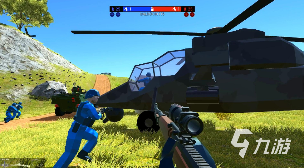 這是款模擬真實戰(zhàn)場的槍戰(zhàn)游戲,在這款游戲中玩家可沒有任何主角光環(huán),只能跟其他的NPC士兵一起上戰(zhàn)場,用手中的步槍、機(jī)關(guān)槍等武器跟敵人進(jìn)行戰(zhàn)斗。玩家的隊友都是一些藍(lán)色的小人兒,敵人身上的顏色都是紅色的,在戰(zhàn)場上很容易區(qū)分出敵我,玩家只要將地圖上所有紅色的小人兒全部干掉就行,你還可以駕駛武裝直升機(jī)和坦克跟敵人交戰(zhàn)哦!