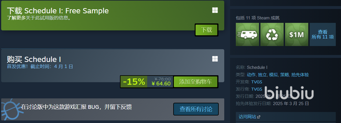 目前,《ScheduleI》正在Steam平臺(tái)預(yù)購。其原價(jià)為¥76,憑借首發(fā)優(yōu)惠-15%的折扣,玩家僅需¥64.60就能將它收入囊中。大家只需登錄上平臺(tái),在搜索欄輸入“ScheduleI”,便能快速定位到該游戲的作品頁面,點(diǎn)擊“加入購物車”,即可輕松完成付款購買。需求注意的是,首發(fā)折扣優(yōu)惠到4月1日截止,大家要抓緊時(shí)間哦!