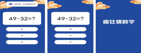 包括的數(shù)學(xué)知識(shí)特別豐富,從簡單的一位數(shù)加減乘除一位數(shù),再到多位數(shù)乘多位數(shù)等等,幾乎覆蓋了所有的人群,在關(guān)卡開始挑戰(zhàn)時(shí)會(huì)隨機(jī)給出不同的題目。屏幕的上方會(huì)隨機(jī)給出題目,在下方又會(huì)有三個(gè)不同的選項(xiàng),其中只有一個(gè)選項(xiàng)是正確的,用自己極好的口算能力,快速尋找到正確的答案即可闖關(guān)。