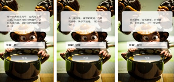 以猴子為主題的猜謎手游,豐富的謎題答案,天文地理古詩成語應(yīng)有盡有,還有很多百科常識(shí)考驗(yàn)小伙伴們的知識(shí)儲(chǔ)備量,以可愛的猴子為背景,每個(gè)關(guān)卡都會(huì)給予相應(yīng)的題目,小伙伴們可以在下方橫線填上答案,然后點(diǎn)擊作答提交。這樣的特色手游老少皆宜。
