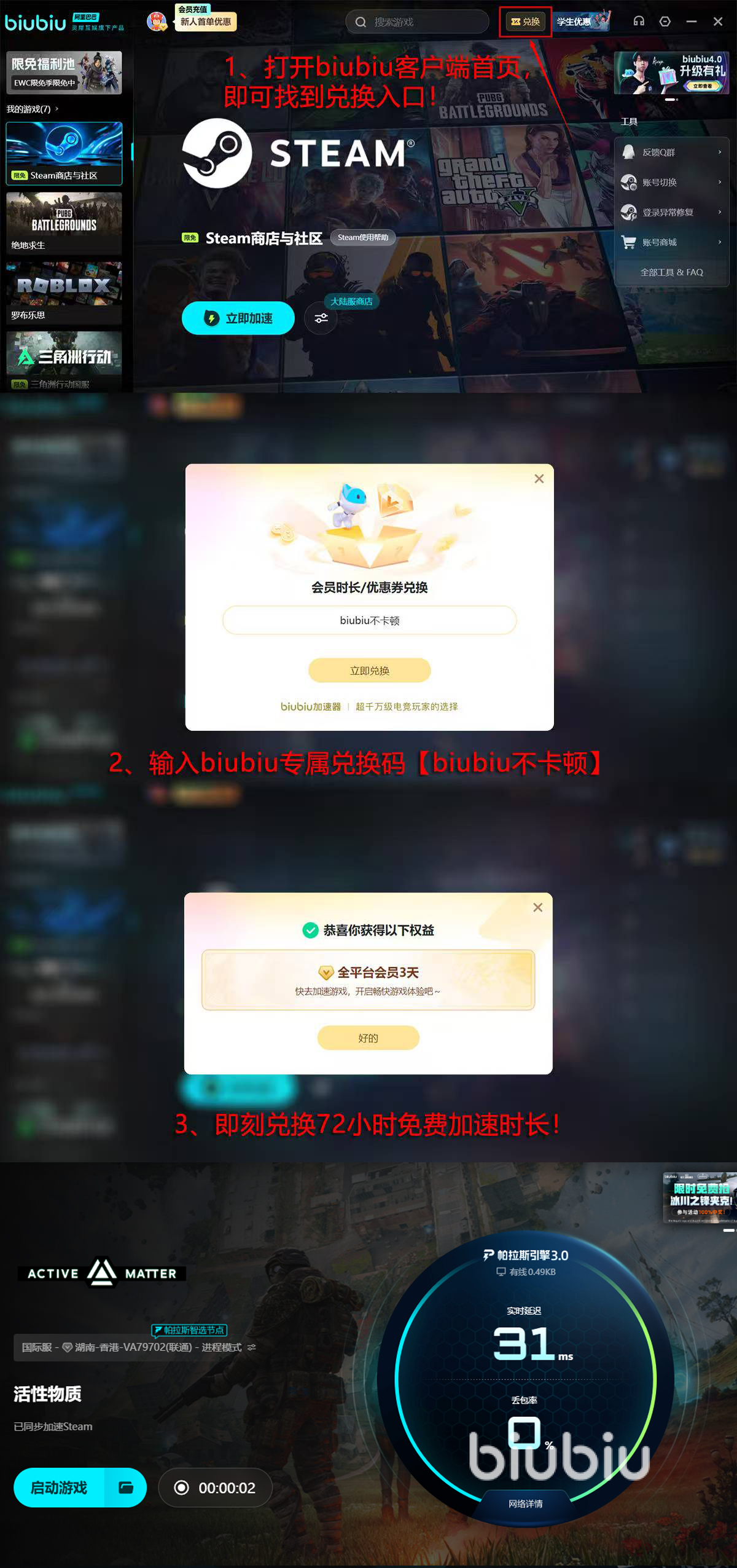 biubiu甚至還邀請(qǐng)了電競(jìng)?cè)Γ?span style="color:rgb(255, 0, 0)">頗具影響力的冠軍選手手Aixleft共同參與新版本用戶(hù)體驗(yàn)提升工作,并確定了最終版本。日前,官方推出多個(gè)免費(fèi)活動(dòng),邀請(qǐng)玩家參與體驗(yàn),如注冊(cè)就有的24小時(shí)福利,還有所有用戶(hù)可兌換72小時(shí)福利的【biubiu不卡頓】口令等,所有活動(dòng)新玩家都可參與,且最高能得到96小時(shí)的福利。