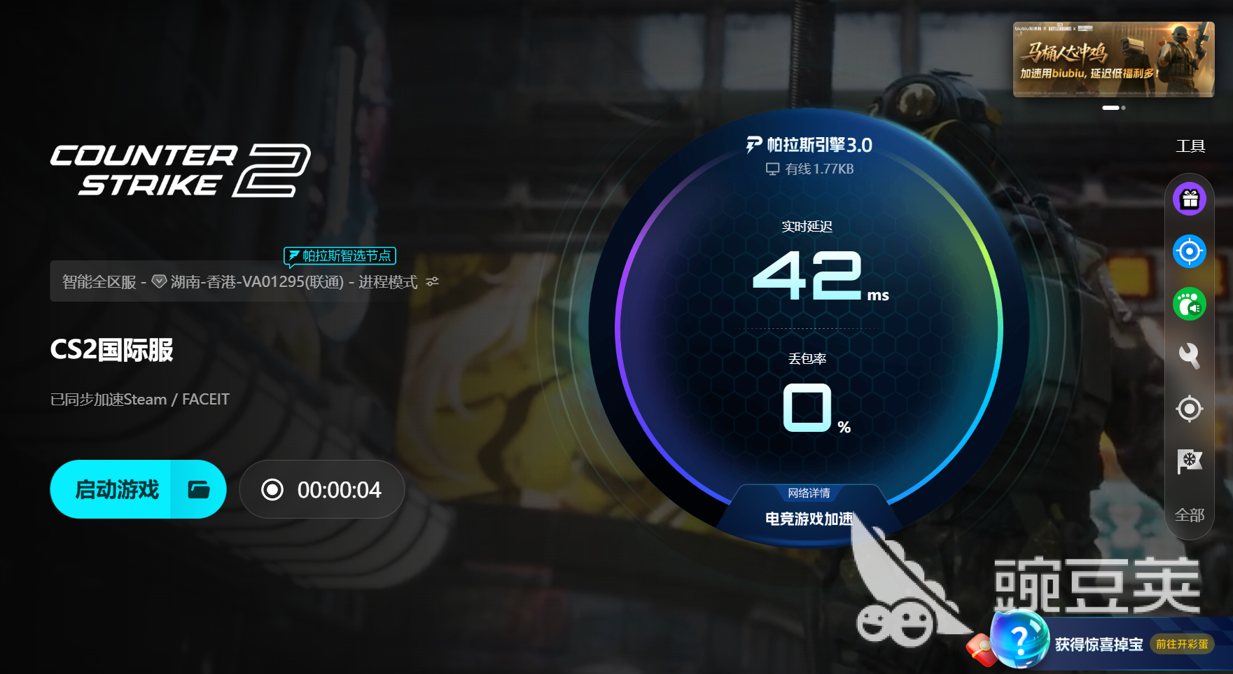 啟動(dòng)biubiu后,在搜索欄輸入CS并點(diǎn)擊對(duì)應(yīng)圖標(biāo)即可一鍵加速。整個(gè)流程簡(jiǎn)潔高效,無需手動(dòng)選擇服務(wù)器或調(diào)整參數(shù),幾秒鐘內(nèi)即可建立穩(wěn)定連接。返回游戲后,即可明顯感受到延遲降低、幀數(shù)平穩(wěn)的提升效果。