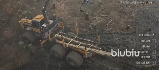 然后大家要操作原木傳送裝置去之前砍伐樹木的區(qū)域?qū)淠具\(yùn)走,這個(gè)傳送裝置也就是大家口中的木材拖車。開車到指定地點(diǎn)之后,大家要控制臂架,移動(dòng)到樹木的上方,將樹木抓住放到車上。