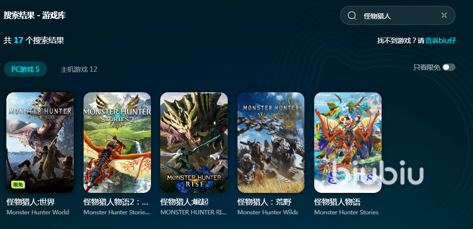 免費(fèi)加速時(shí)長(zhǎng)管夠了,那資源能不能達(dá)到大家的要求呢?biubiu里有上萬款游戲的加速資源,搜索怪物獵人就能看到崛起、物語、荒野、世界等多個(gè)系列的資源,PC和主機(jī)游戲加起來一共17款!想玩什么還不是手到擒來,并且平臺(tái)還限時(shí)開放了怪物獵人世界PC游戲免費(fèi)加速,簡(jiǎn)直太棒了。