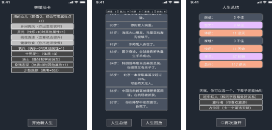 從嬰兒時期開始,玩家就需要在人生節(jié)點上做出選擇,去培養(yǎng)角色的智商,還有能力可以大膽投資成為老板、也可以埋頭苦讀成為學霸或者是做一個普通人。不同的初始屬性還有選擇,都會有一個不同的人生結(jié)局,就好像是在虛擬的世界中過了另外一輩子。劇本中會有許多中國式的生活細節(jié),例如在學??荚?,還有職場打拼都很真實。角色的成長也有一個很清晰的升級空間,每一次選擇都可以看到所產(chǎn)生的影響。