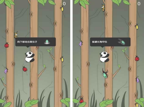 這款叫做熊貓爬樹的,既可讓大家看到整體的游戲畫面,就是以可愛的小熊貓?jiān)跇渖吓逝劳娣橹?,也?huì)在整個(gè)過程當(dāng)中,遇到一些小蟲子,其中有一些蟲子,小貓可以將其擊落,也有一些是需要通過躲避的方式,才能讓自己不斷向上攀爬的。涵蓋了現(xiàn)實(shí)生活中很多的蟲子,比如七星瓢蟲以及長角甲蟲等,需要有很好的控制能力。