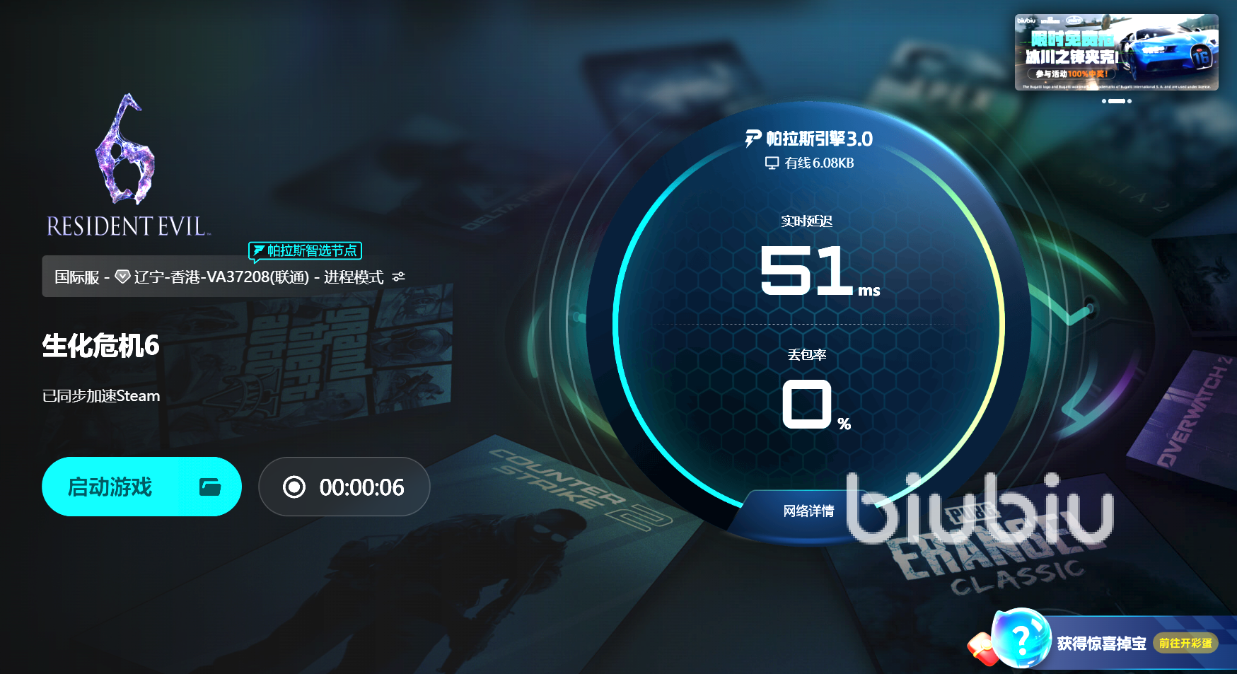 在操作體驗(yàn)方面,biubiu加速器依舊是保持直觀簡潔的。玩家只需開啟客戶端,在搜索欄寫入生化危機(jī)6,再選擇加速專區(qū)并點(diǎn)擊進(jìn)入,即可自動(dòng)完成優(yōu)化,全程無需復(fù)雜設(shè)置。軟件后臺(tái)占用極少,不會(huì)讓設(shè)備性能拖慢,同時(shí)還會(huì)兼容多個(gè)游戲平臺(tái)。不僅能解決《生化危機(jī)6》的閃退問題,也能讓其他熱門網(wǎng)絡(luò)游戲優(yōu)化,一款工具即可多用。