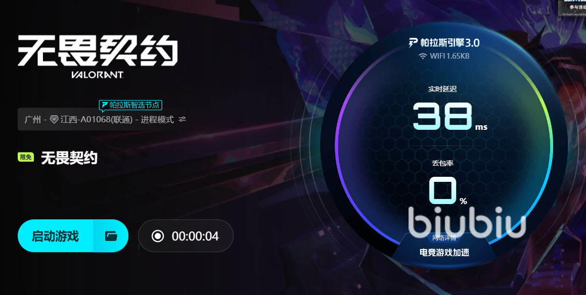 其次需重點排查網絡因素對閃退的影響。很多玩家認為閃退僅與設備相關,卻忽略了無畏契約的聯(lián)網特性,游戲啟動時需完成服務器驗證,對戰(zhàn)加載階段要同步地圖數據與玩家信息,若網絡連接不穩(wěn)定,數據傳輸中斷或延遲過高,會觸發(fā)客戶端 “數據校驗失敗”,直接導致閃退。這種情況下,單純調整設備設置無法解決問題,需借助專業(yè)工具優(yōu)化網絡連接,biubiu加速器便是適配性較強的選擇。