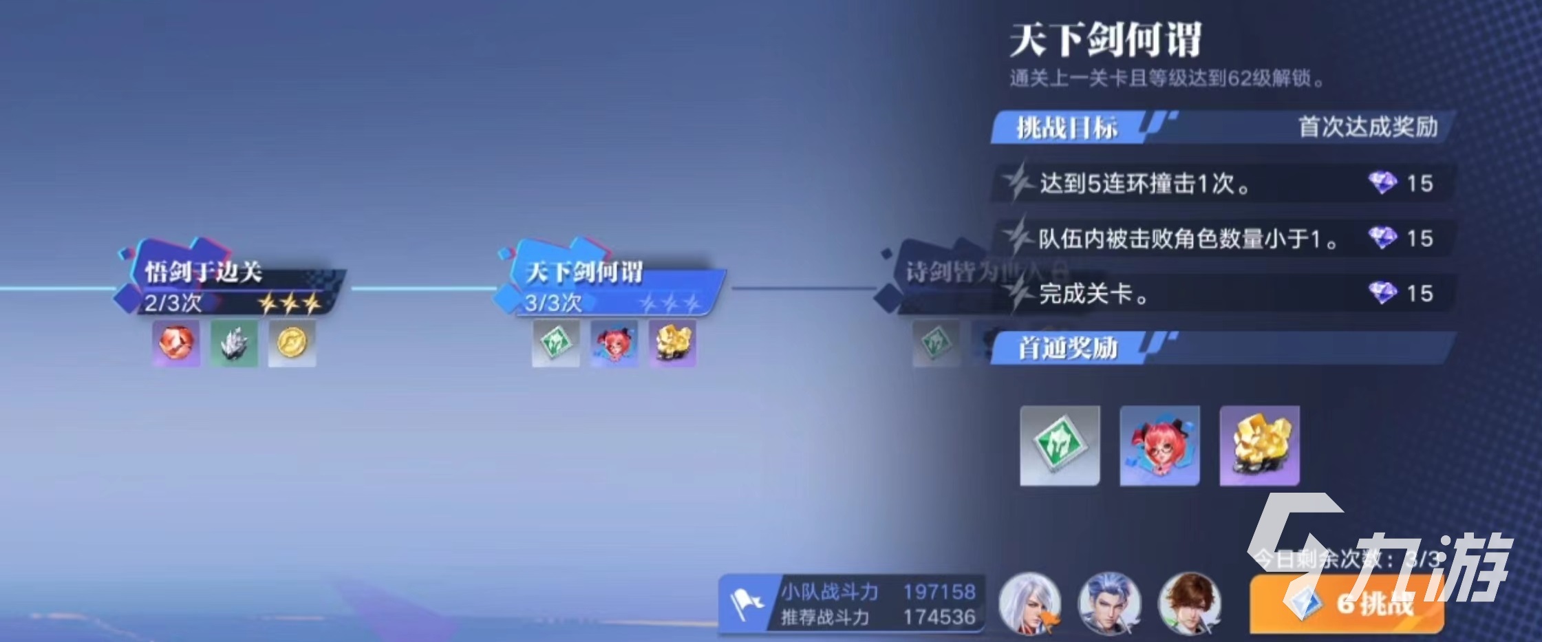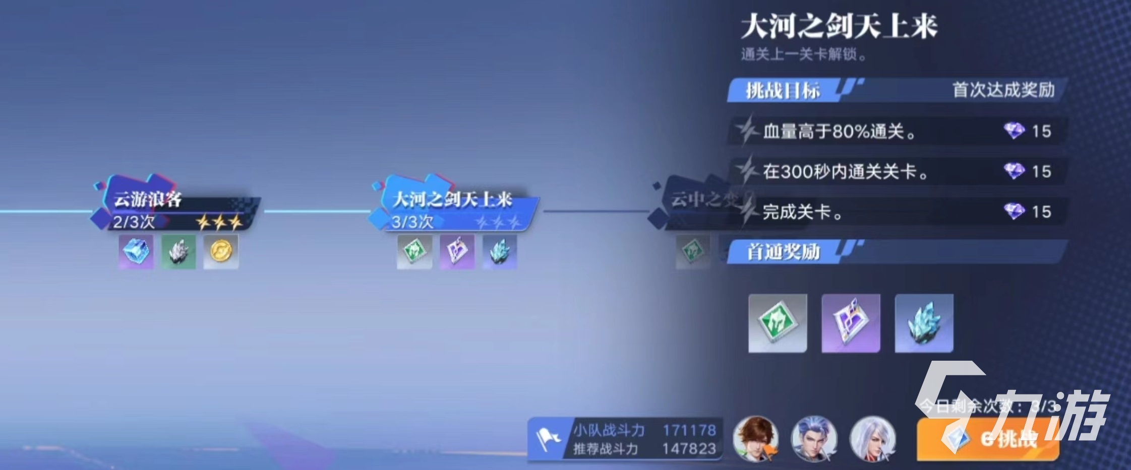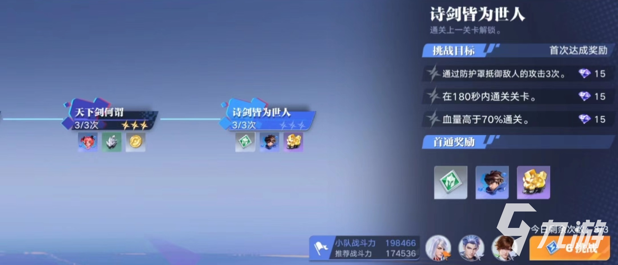 第1關(guān)一詩(shī)撼長(zhǎng)安,需要玩家在指定時(shí)間之前到達(dá)終點(diǎn),而且血量要高于80%,這樣才能達(dá)到圓滿程度,需要注意擊殺一名敵人可以增加5秒鐘,利用這點(diǎn)可以降低難度。第2關(guān)云游浪客,去擊敗4個(gè)機(jī)關(guān)核心,總共有10個(gè)敵人在180秒內(nèi)全部清理完成,去不同地點(diǎn)擊破核心,必須將時(shí)間合理利用起來(lái)。第3關(guān)大河之劍天上來(lái),通過(guò)一處復(fù)雜地形,并且遇到遭遇戰(zhàn),隊(duì)伍里被擊敗角色數(shù)量少于一人,注意狄仁杰令牌傷害和激光傷害。