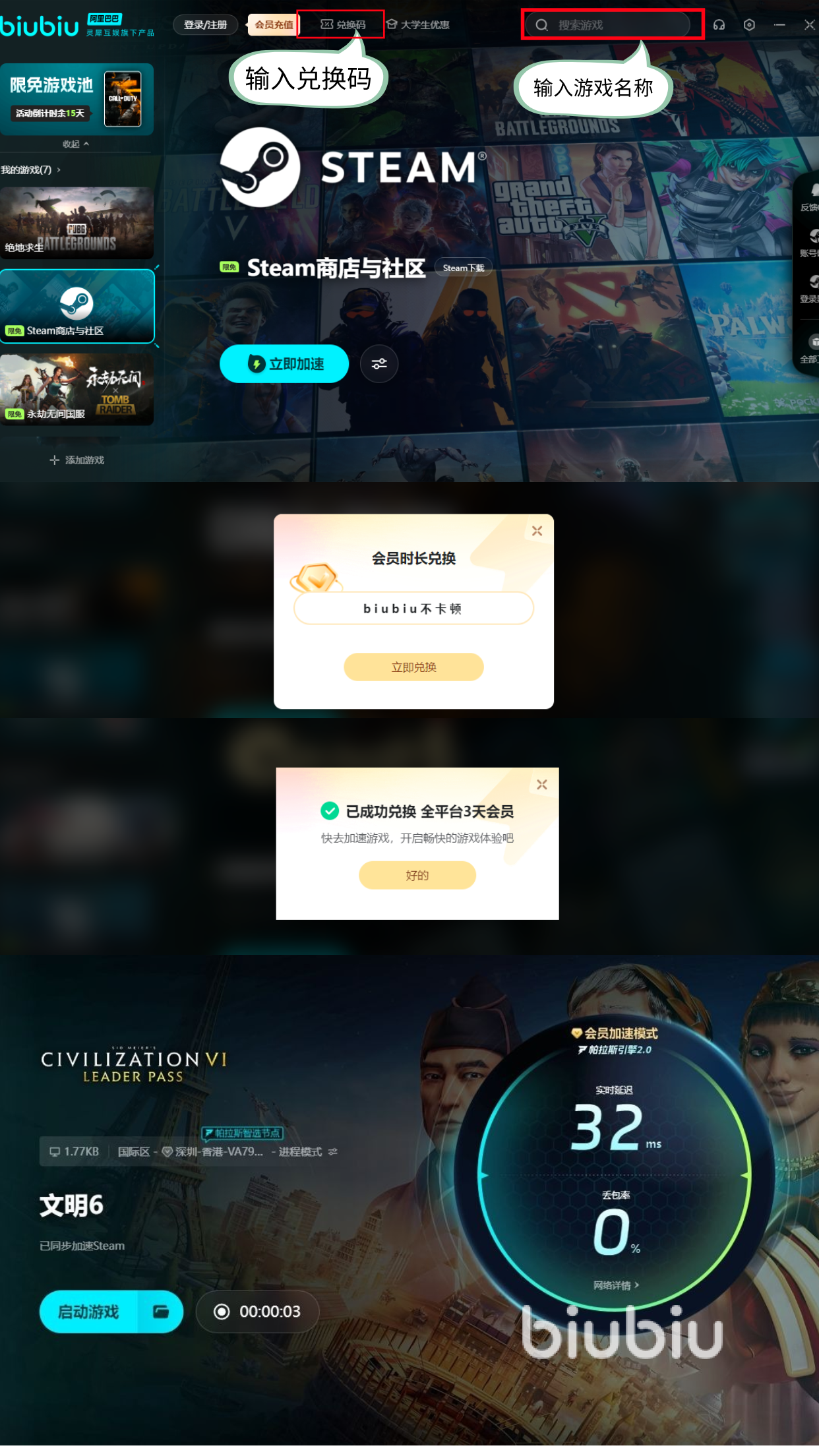因為大家玩很多電腦游戲都需要用到加速器,所以小編也給大家?guī)砹艘豢畛夁m合文明6這款作品的加速應用——biubiu,新用戶登錄現(xiàn)在立刻就可以享受一整天的免費加速時長,此外,平臺的每個小伙伴還可以通過【biubiu不卡頓】額外領取三天的體驗時間,都是無償免費提供的。