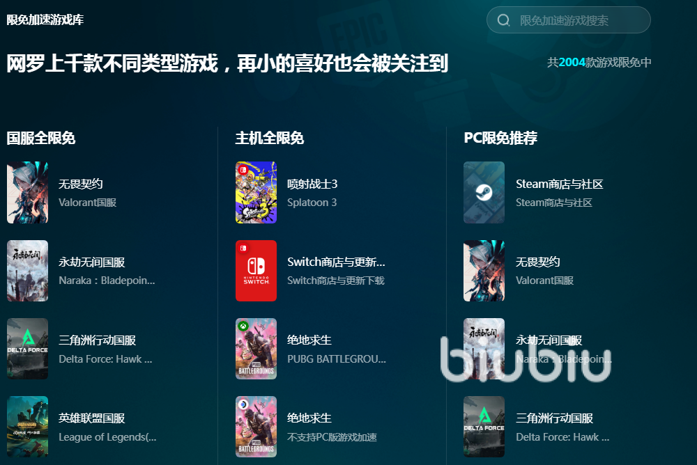 除此之外biubiu還準備了很多好玩的游戲,如果你正好游戲荒不知道玩什么,不妨來biubiu游戲庫找一找靈感。軟件還專門開辟了一個限免加速游戲池,除了國服游戲以外還有很多國際游戲也是限免加速的。免費游戲領取更是搜羅了各種優(yōu)質(zhì)游戲免費贈送給大家,關注喜加一就不會錯過免費游戲上新了。