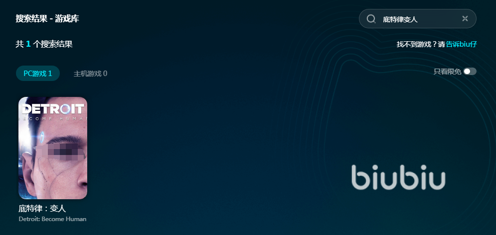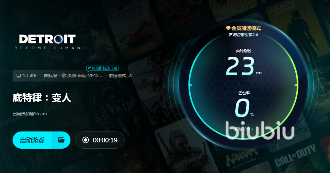 biubiu支持加速的游戲特別多,能用應用在電腦游戲、主機游戲和手機游戲上面,用它來玩底特律變?nèi)嗽龠m合不過。只要輸入游戲名就能搜索到資源,加速啟動也很方便,通過點擊藍色按鍵來加速,界面清晰明了,新手也會用。