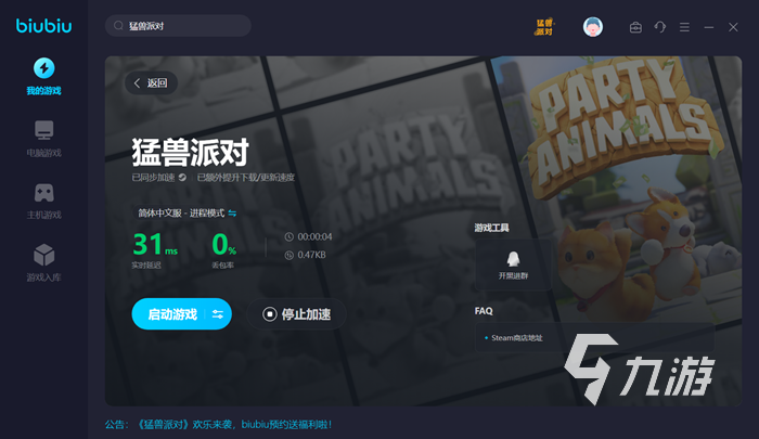 游戲中需要我們根據(jù)場面局勢進行即時操作,更是需要應對其他玩家的攻擊和場景的變化,擁有一個穩(wěn)定高速的網(wǎng)絡環(huán)境十分重要。點擊上方的鏈接下載今天小編推薦的biubiu加速器,新用戶更是能夠領取24小時免費加速。在biubiu加速器中我們就可以直接鍵入猛獸派對的游戲名稱來找到相關的加速服務。這里我們可以看到平臺貼心地為我們提供了限時免費加速的服務,這段時間想要體驗的小伙伴都可以來嘗試一下。