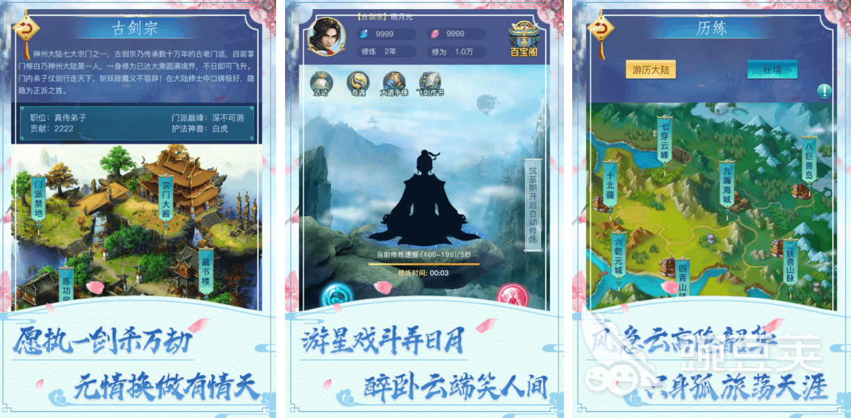 這是一款劇情驅(qū)動型的免費飛升類修真游戲,支持單手豎屏操作,適合碎片化時間游玩。技能特效炫酷震撼,玩法豐富多樣。玩家可攜神獸寵物共渡天劫,體驗驚心動魄的突破時刻。隨著等級提升,還能建立門派、收徒授業(yè),逐步成長為一代宗師。江湖氣息濃厚的世界觀設(shè)定,使整個修真歷程更具故事張力。