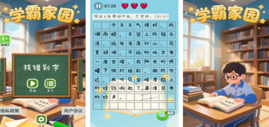 這款有趣的文字修正類游戲,鍛煉你的毅力,以及耐力和具體的觀察能力。每個(gè)關(guān)卡當(dāng)中都會(huì)給予一篇相應(yīng)的文章,有的是普通的作文,有的是優(yōu)秀的日記??此七@些文章比較正常,但真正探索之后就會(huì)發(fā)現(xiàn)其中包含很多錯(cuò)別字,甚至也有很多病句,小伙伴們需要找出來(lái)并修改,這樣才能夠完成關(guān)卡,此游戲?qū)閷W(xué)習(xí)愛(ài)好者所打造,有機(jī)會(huì)從學(xué)渣逆襲成為學(xué)霸。