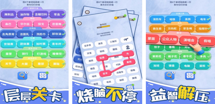 腦動詞場是一個趣味性比較強的消除游戲,一般的消除玩法都是消除各種物品,但是在腦洞詞場這個游戲里,設(shè)定了大量的詞語,玩家需要把類別相同的詞語移動到一行,這樣整行都會被消除,接著系統(tǒng)會補位更多詞語,大家可以在游戲里通過不斷消除累積積分,是一個非常考驗玩家腦力,并且可以發(fā)掘深層次關(guān)聯(lián)的手游。