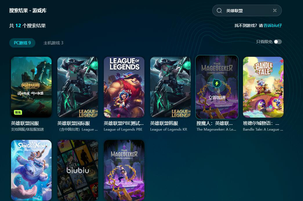 不僅如此,在7月8日到8月24日這段暑假期間,英雄聯(lián)盟還有可能進(jìn)入biubiu限免游戲名單之中,屆時(shí),玩家可連續(xù)多日直接使用會員加速,無限暢玩。想要知道哪些游戲正在限免,可每日登錄biubiu客戶端首頁查看,每日都有新限免游戲加入!