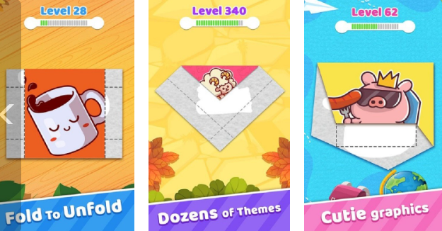 它是以折紙為核心的玩法,大家用手指在屏幕上點一點,就可以把虛擬的紙折成各種圖形,每一關的難度都不一樣,一開始是簡單的三角形、正方形、到后面會變得越來越難,需要折出立體結構,像小房子小動物什么的折紙的過程,不光好玩還鍛煉腦子和動手能力,折的多了空間想象力和邏輯思維也會變得很強,不要擔心學不會,跟著教程一步一步來,很快就可以上手。