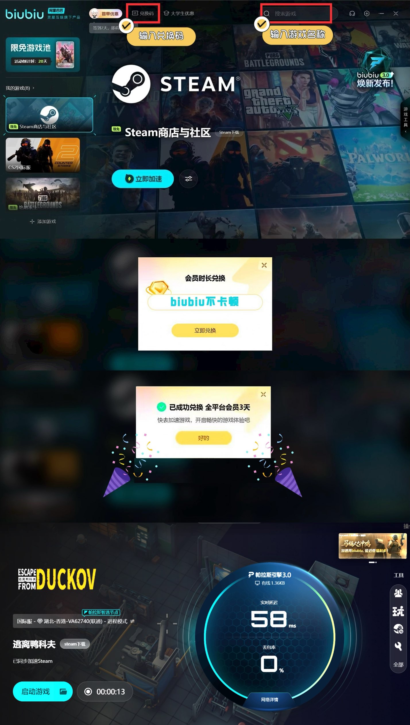 另外平臺(tái)還為新老用戶準(zhǔn)備了多項(xiàng)貼心福利,對(duì)于第一次邂逅的新用戶,在首次注冊(cè)即可免費(fèi)領(lǐng)取24h免費(fèi)體驗(yàn)時(shí)間,無(wú)需付費(fèi)即可體驗(yàn)加速效果,輕松判斷是否滿足需求。另外平臺(tái)所有伙伴均可在兌換中心輸入口令【biubiu不卡頓】,還能繼續(xù)兌換到3天免費(fèi)加速權(quán)限,累計(jì)可享近百小時(shí)的優(yōu)質(zhì)服務(wù)。