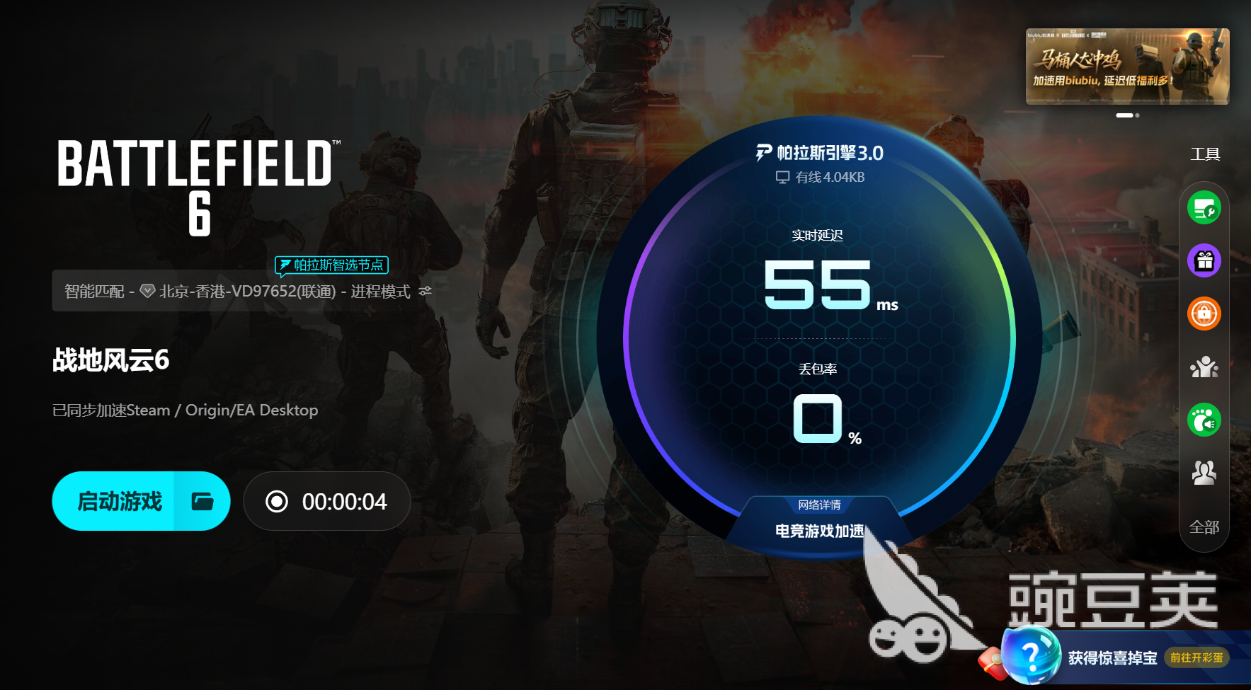 實際體驗改善明顯。開啟加速后,戰(zhàn)地6的加載效率大幅提升,從原先長時間停滯變?yōu)榱鲿惩瓿?。進入戰(zhàn)場后畫面清晰穩(wěn)定,射擊反饋精準(zhǔn)及時,不再出現(xiàn)擊殺命中后延遲顯示提示的情況。載具操控響應(yīng)靈敏,轉(zhuǎn)向與射擊動作同步執(zhí)行。爆炸特效與建筑損毀動畫連貫播放,無花屏、無閃退。語音通信清晰穩(wěn)定,團隊?wèi)?zhàn)術(shù)指令可即時傳達,協(xié)同作戰(zhàn)更加高效。