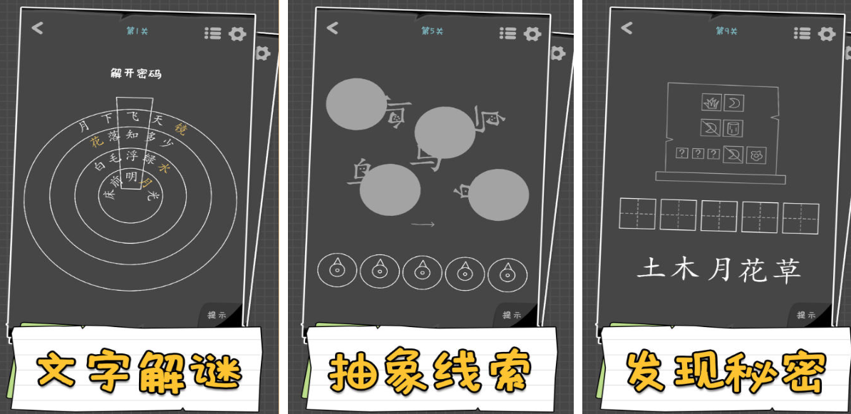 猜字達(dá)人這款文字解謎類手游帶來的辨識度更高,因?yàn)檎w畫面超級簡單也顯示出簡體漢字風(fēng)格,尋找漢字、漢字解謎等超多解謎性質(zhì)耐玩性更高,幾乎所有的漢字解謎關(guān)卡呈現(xiàn)的難度都比較高,好在有著良心的提示方式能找到解謎關(guān)鍵,白底黑字畫面呈現(xiàn)猶如面對一張潔白的試卷,很沉浸的孩子主題解謎性質(zhì)也極為有趣。