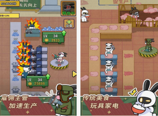 作為以工廠流水線模擬經(jīng)營為主的,玩家將會置身于兔克們的世界當中,里面的人物都是以可愛的小兔子擬人化為主的,在工廠當中有很多大家都沒有見過的流水線,還有各種各樣的產(chǎn)品,無論是曾經(jīng)特別火爆的大哥大,甚至是很多好吃的食物等,都能利用不斷雇傭主管,加速生產(chǎn)的方式,增加收入模擬的80年代工廠的樣子。