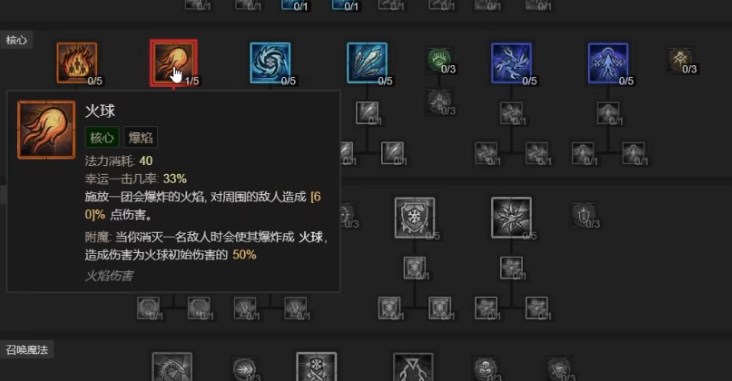 然后13級點出“多頭蛇”和“強化多頭蛇”,這時候就到了15級,去做附魔任務,主要附魔的技能還是火球術(shù),清怪最快的還是這個技能。之后18級19級20級可以點出核心天賦“火墻”、“強化火墻”、“法師火墻”。這時候火墻就成了主要輸出技能,可以多使用了。
