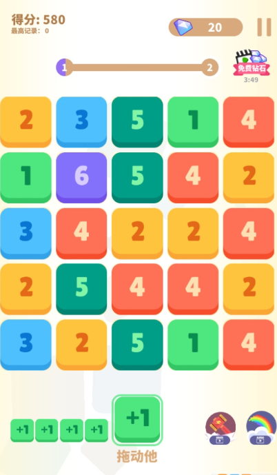 在這里大家需要點各種不同的數(shù)字模塊來進行融合,每次融合就會將兩個數(shù)字相加在一起,并收獲對應的積分,大家的目標是在有限的資源里面通過自己的策略配合,從而讓累積的分數(shù)達到突破關(guān)卡的設定值。