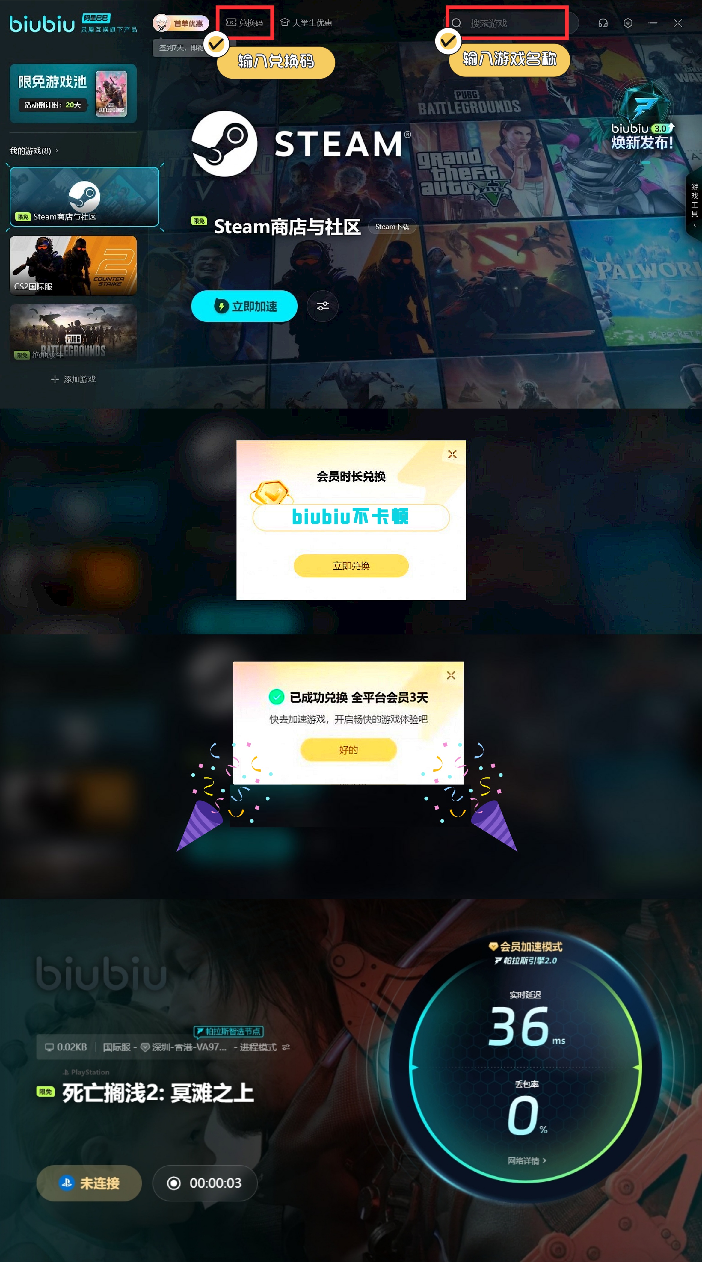 若玩家希望解鎖更多加速時(shí)長(zhǎng),可主動(dòng)點(diǎn)擊兌換按鈕,并通過【biubiu不卡頓】來領(lǐng)取72小時(shí)免費(fèi)加速時(shí)長(zhǎng)。